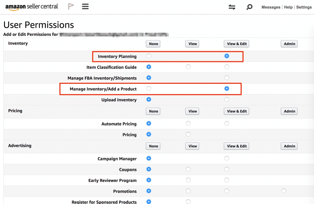 Set the permissions as they appear in the picture above. The employee can “View & Edit” only the Inventory Planning and Manage Inventory/Add a Product. The rest will be set to “None”.