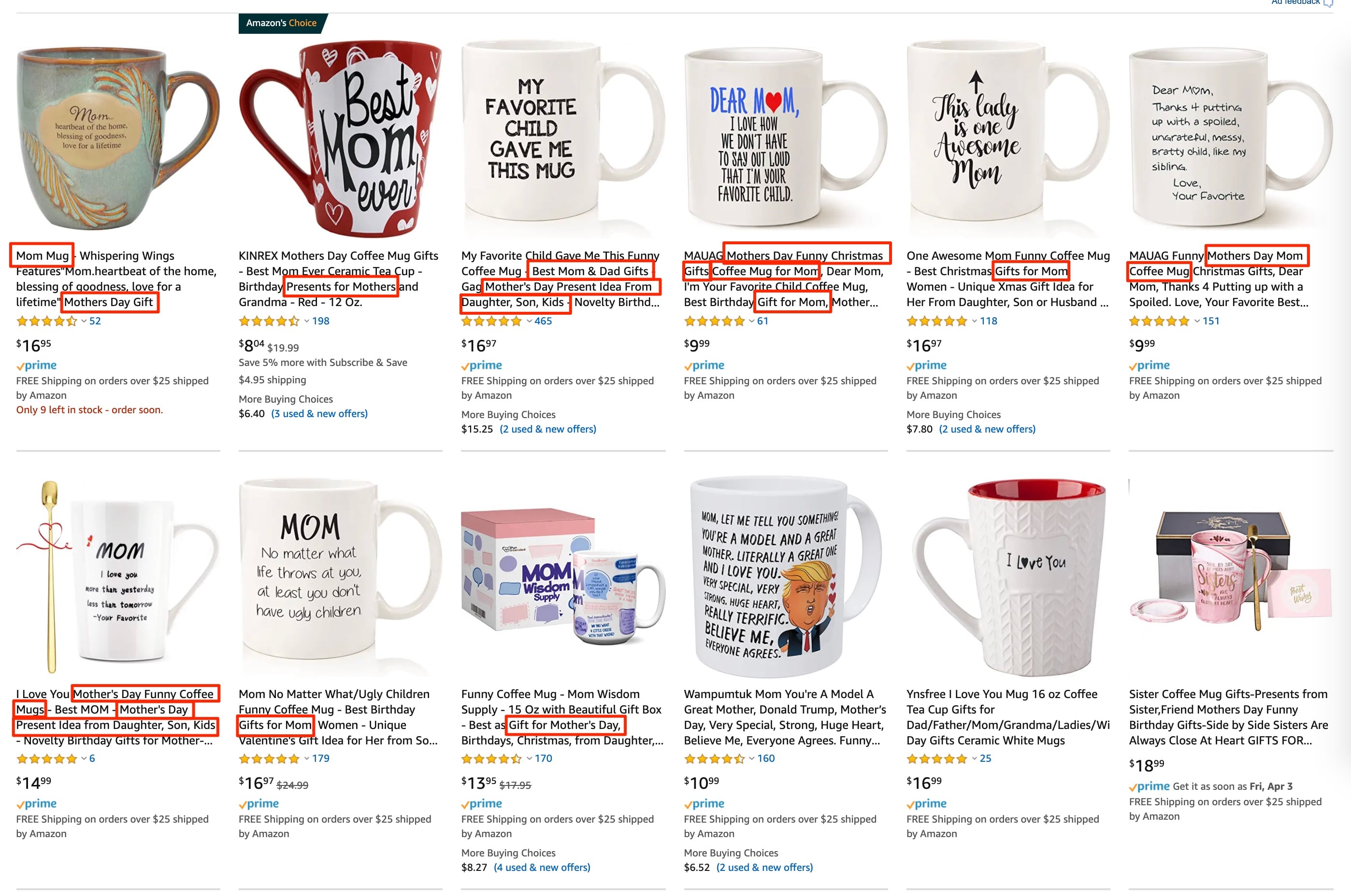 You can see that there are some common keywords such as “Gifts for Mom”, “Gifts for Mother’s Day”, “Mother’s Day Present Idea”, and “Mom Coffee Mug”.