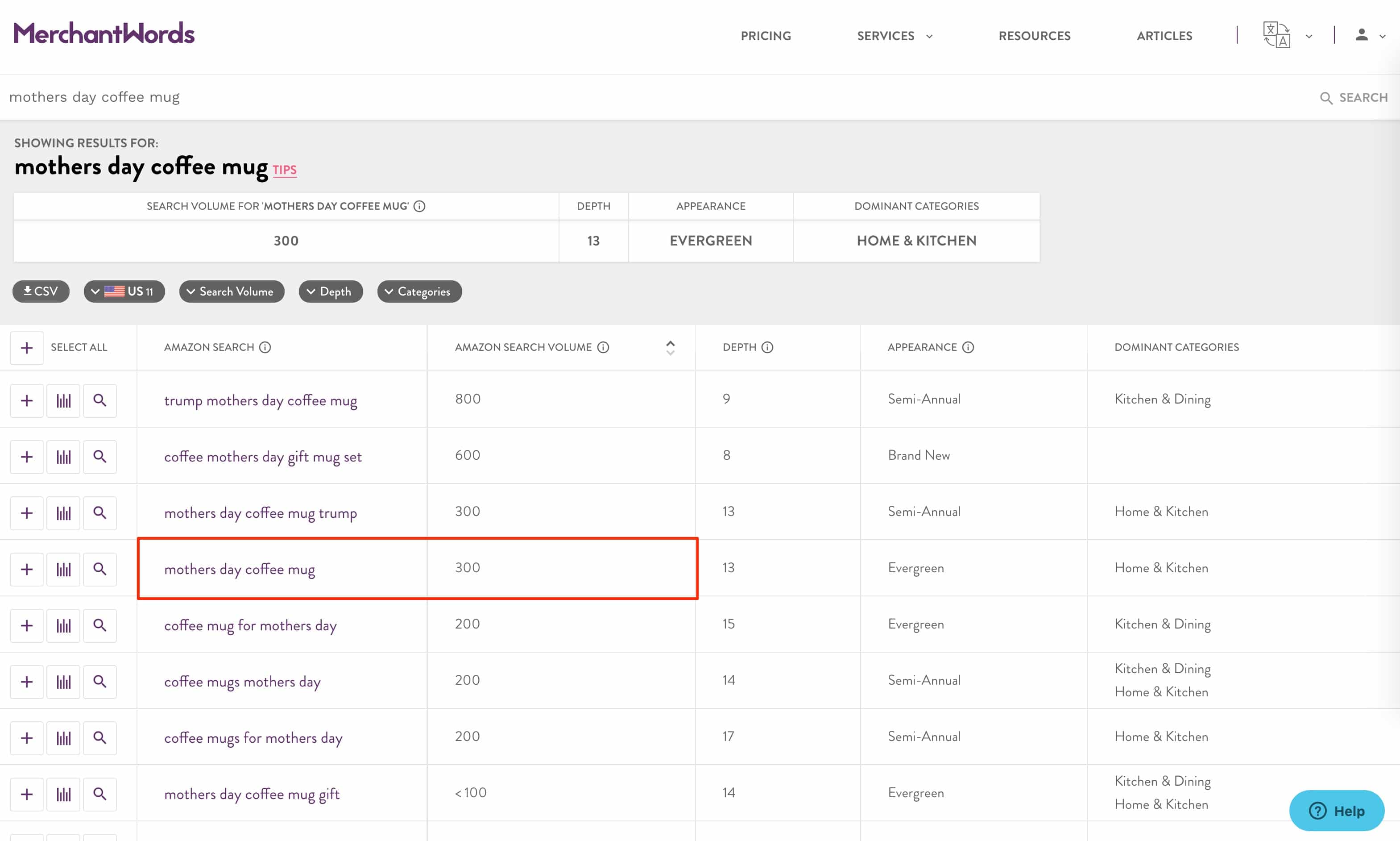 To do this, I’ll use MerchantWords to find the search volume for the keyword “mother’s day coffee mug”.