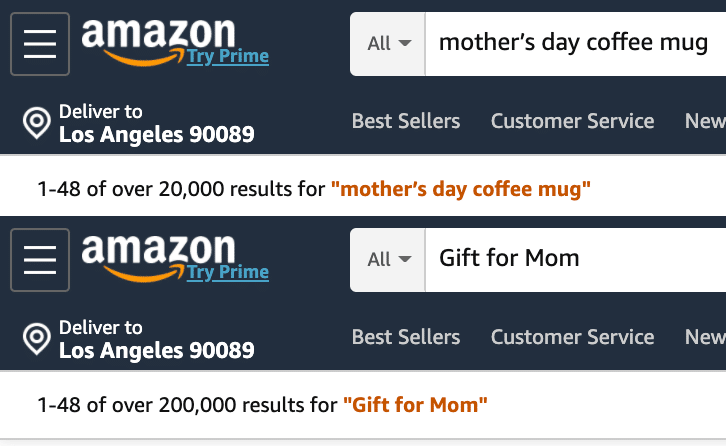 There are 20,000 results for the keyword “mother’s day coffee mug” and 200,000 results for the keyword “gift for mom”.