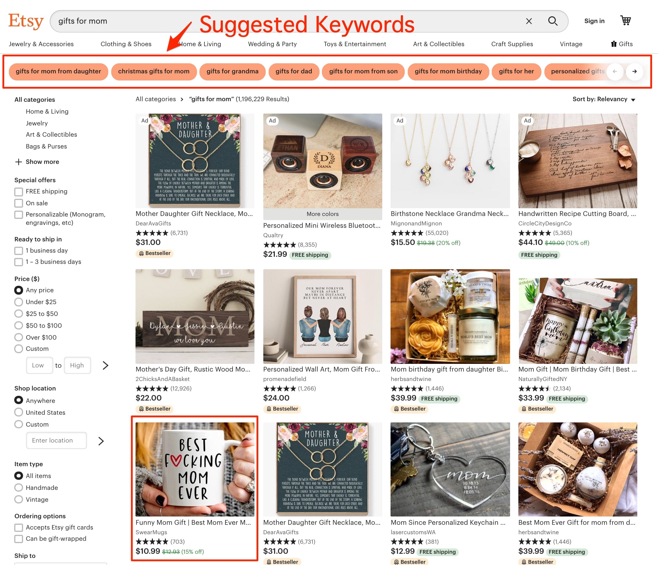 Anyway, if you look at the top of the page, there are some suggested keywords from Etsy such as “gifts for mom from daughter”, “Christmas gifts for mom”, “gifts for mom from son”, “gifts for mom birthday”, etc.