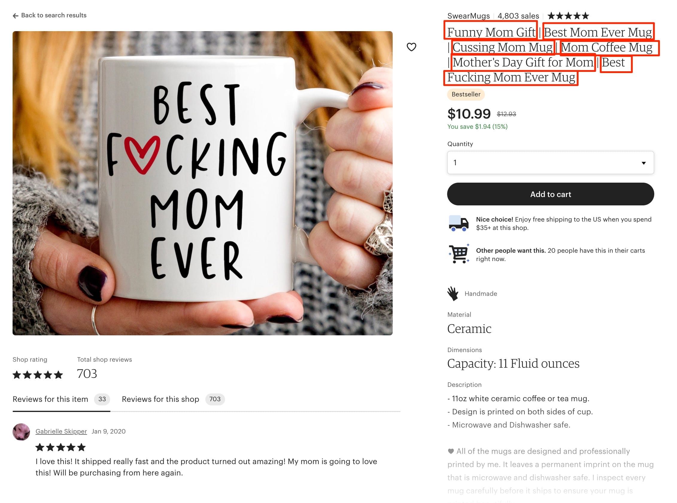 But if you notice, this seller focuses on the keywords that contain the word “Mug” or “Coffee Mug”.