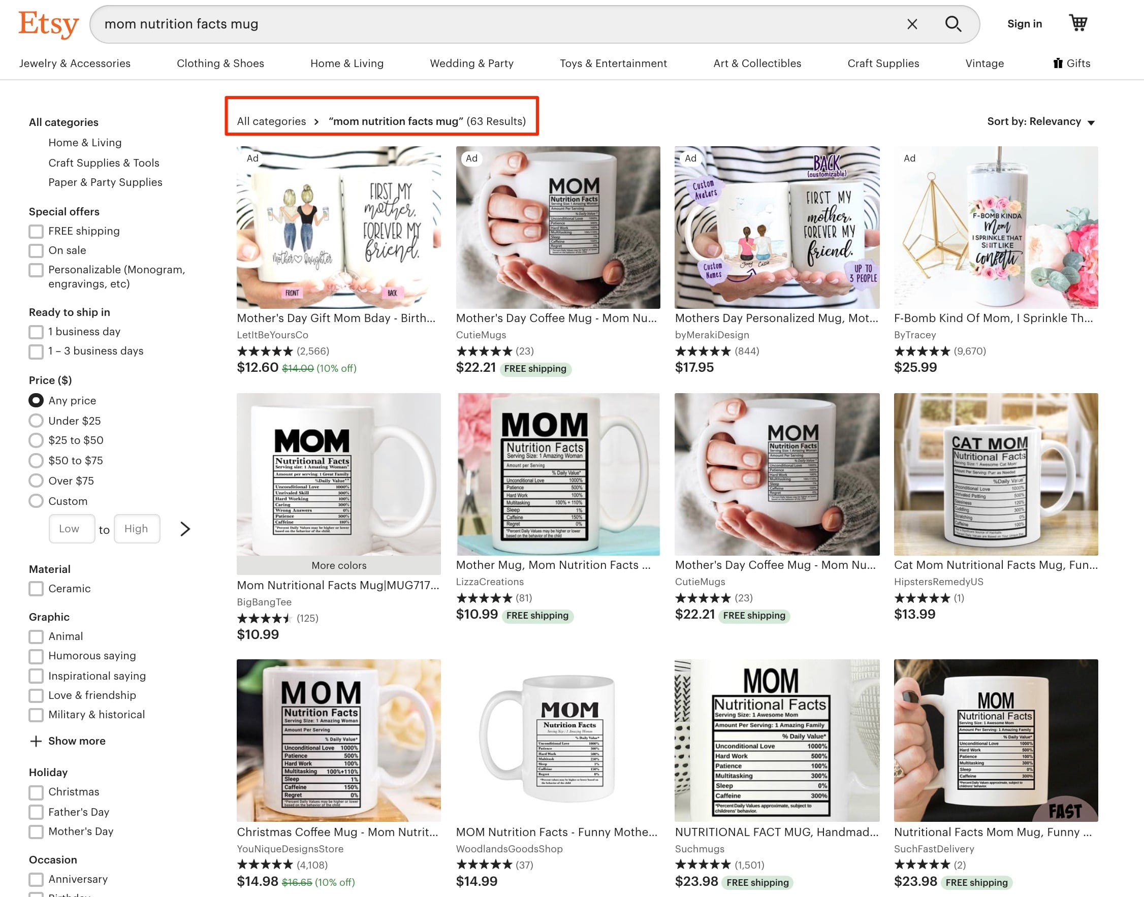 These are product results from the keyword “mom nutrition facts mug” in Etsy.