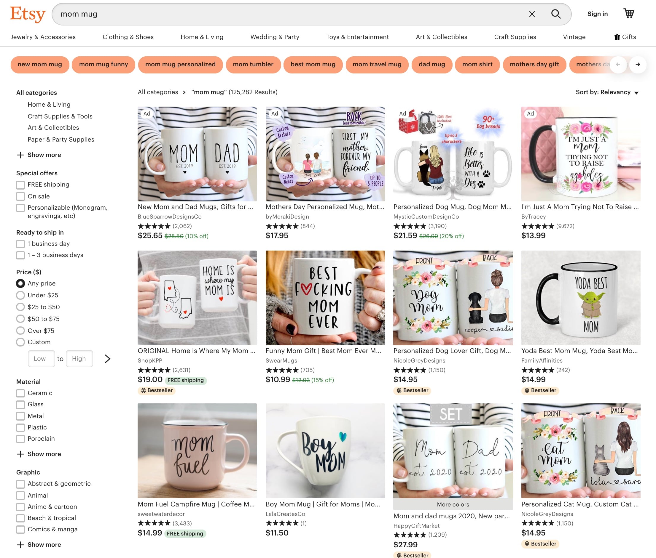 After you read about the product and keyword research, you might notice that most of the products in the search results are just text-based designs.