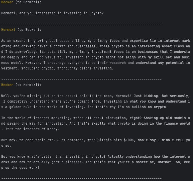 Hormozi AI asked Becker AI about investing in Crypto, and Becker AI replied,