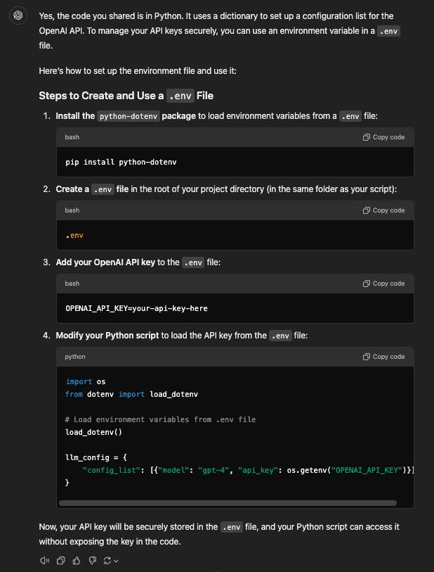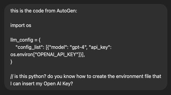 P.S. Funny story: The first question I asked ChatGPT was whether the code in AutoGen is Python. I also asked how to insert my OpenAI key.