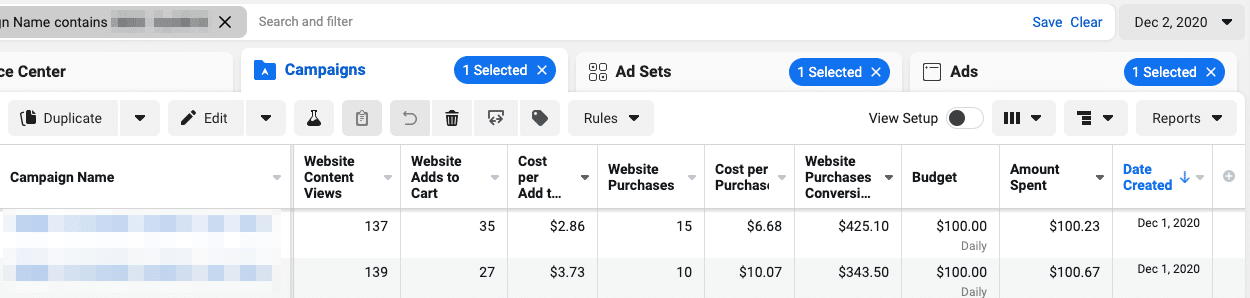 So I duplicated these two campaigns to new ones and set $300 daily budgets for each.