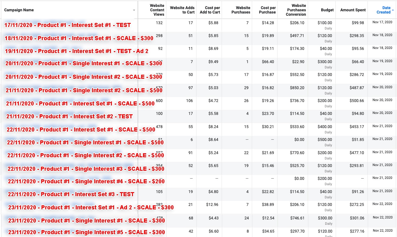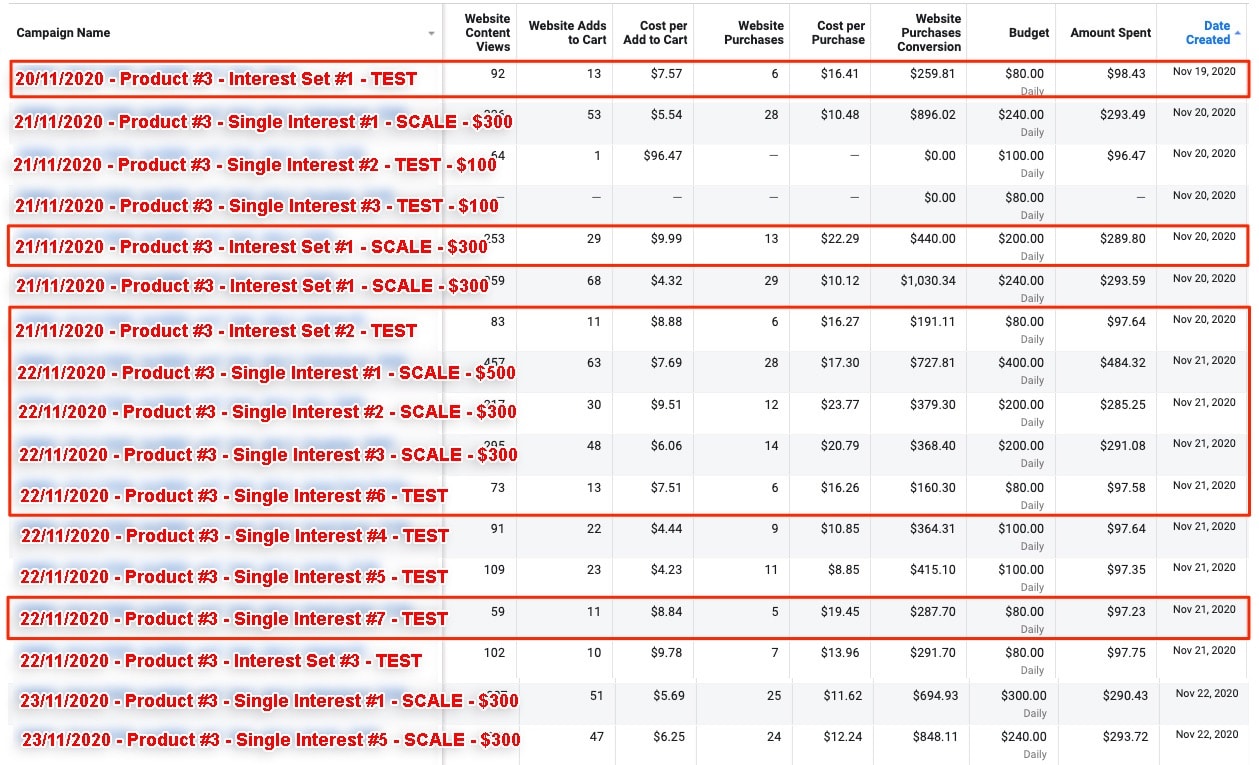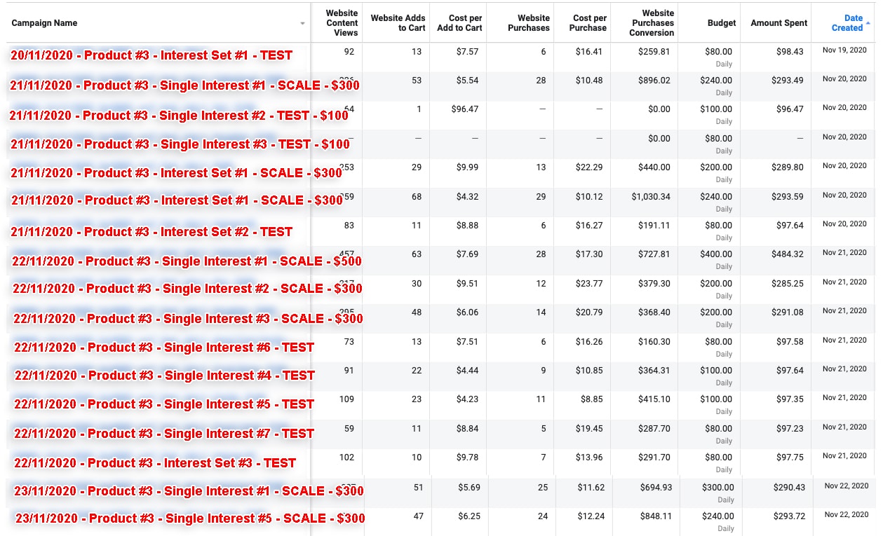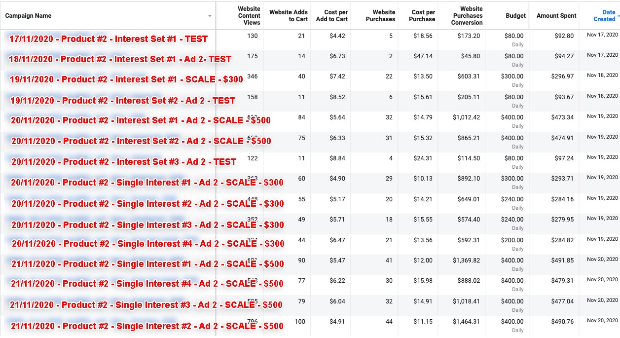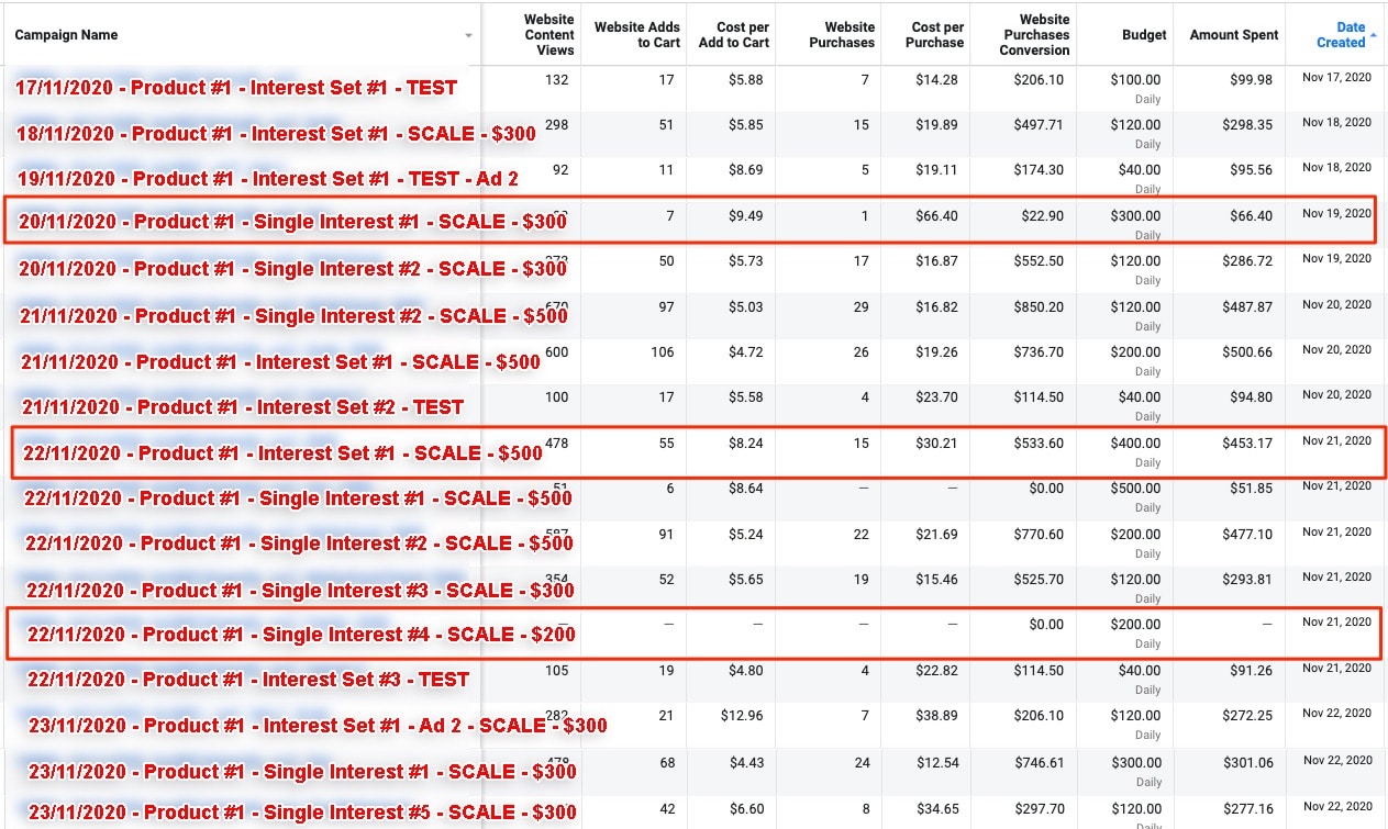 I duplicated the campaigns of Single Interest #1 and #3 and set the daily budget to $500. I wasn’t sure whether they’d work or not, but since I had reduced budgets and paused so many campaigns, I wanted to give this product a higher budget.