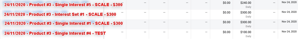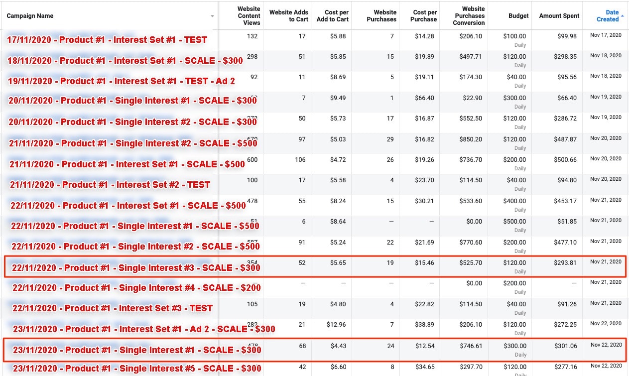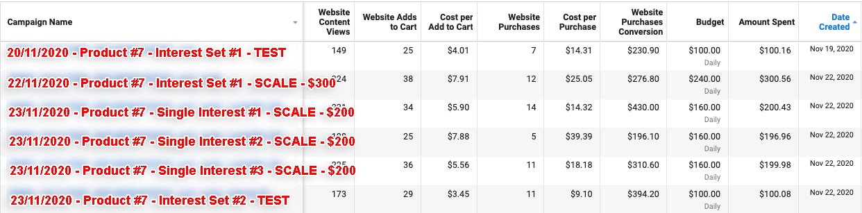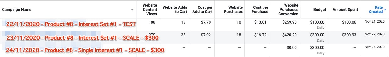 Anyway, I checked both the TEST and SCALE campaigns and found that one interest produced many sales today. I created a Single Facebook interest for this campaign and set the daily budget to $300.