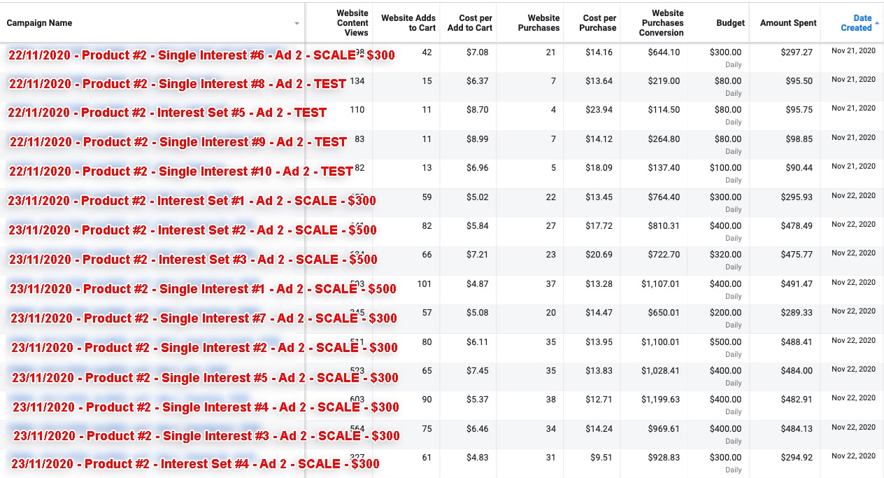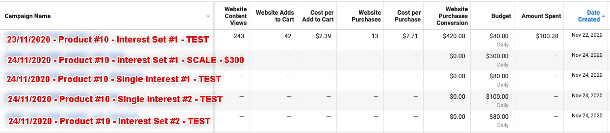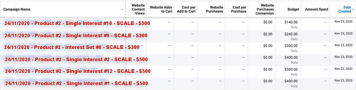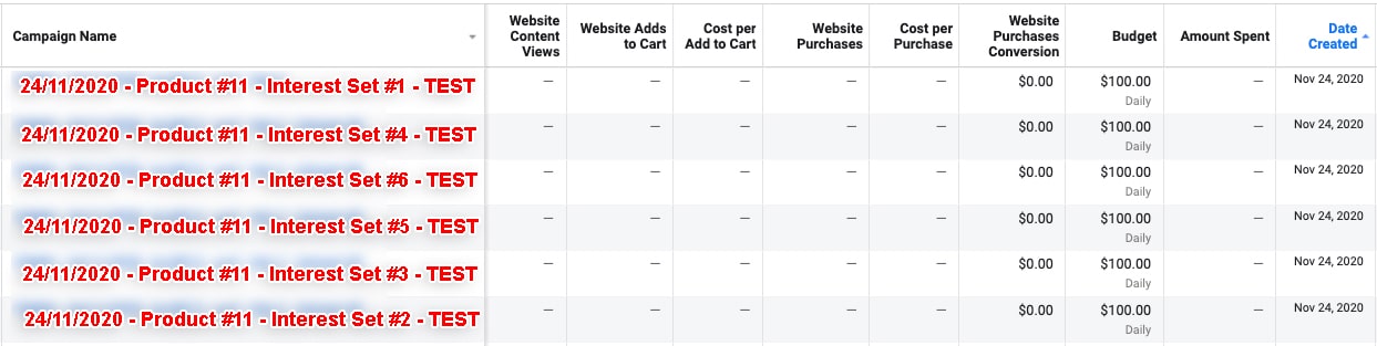 Then, I created 6 campaigns for this product. These campaigns were the Multiple Facebook Interest Campaigns I copied from the campaigns of Product #2.