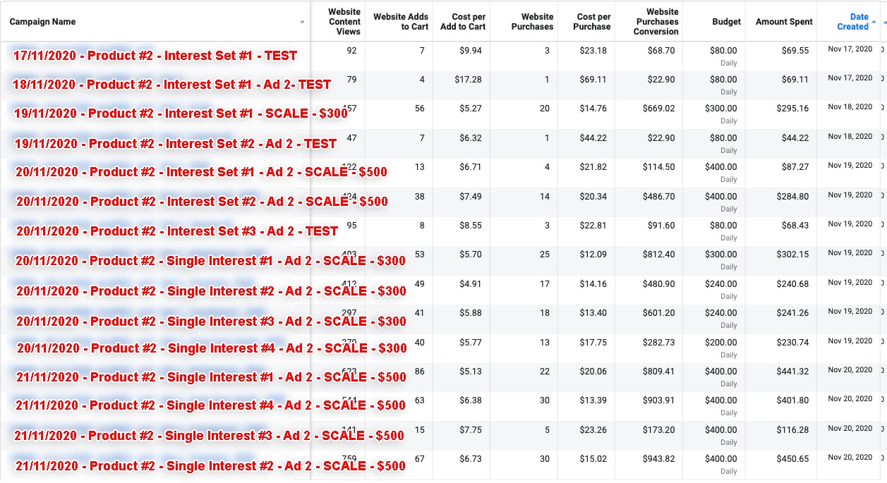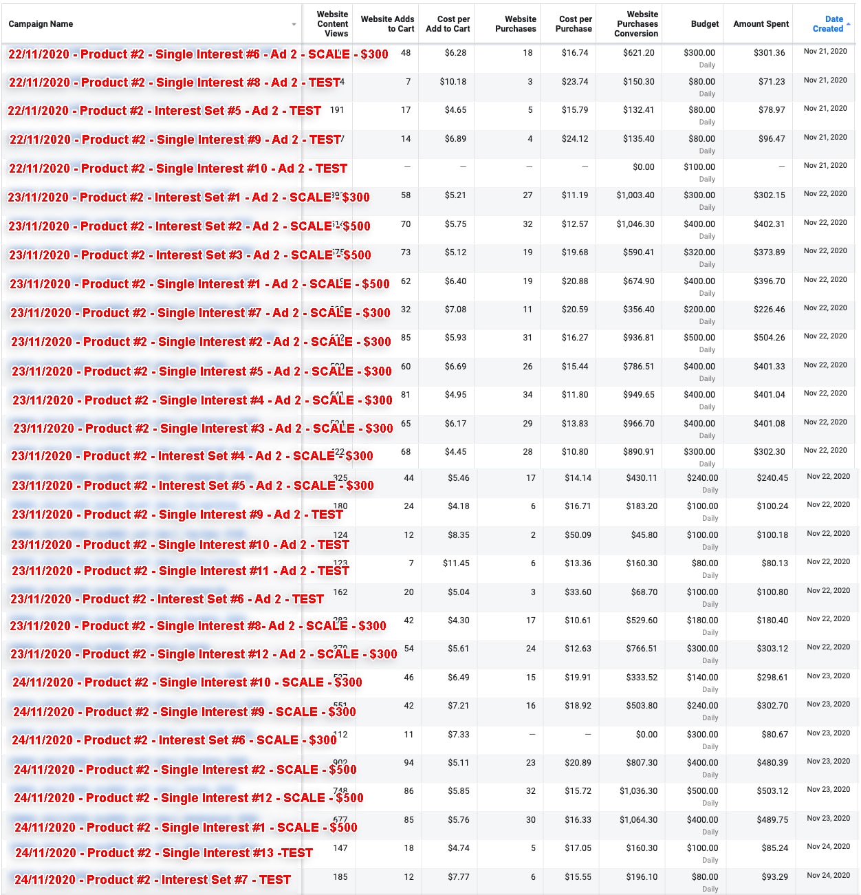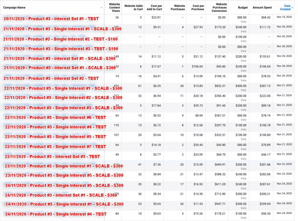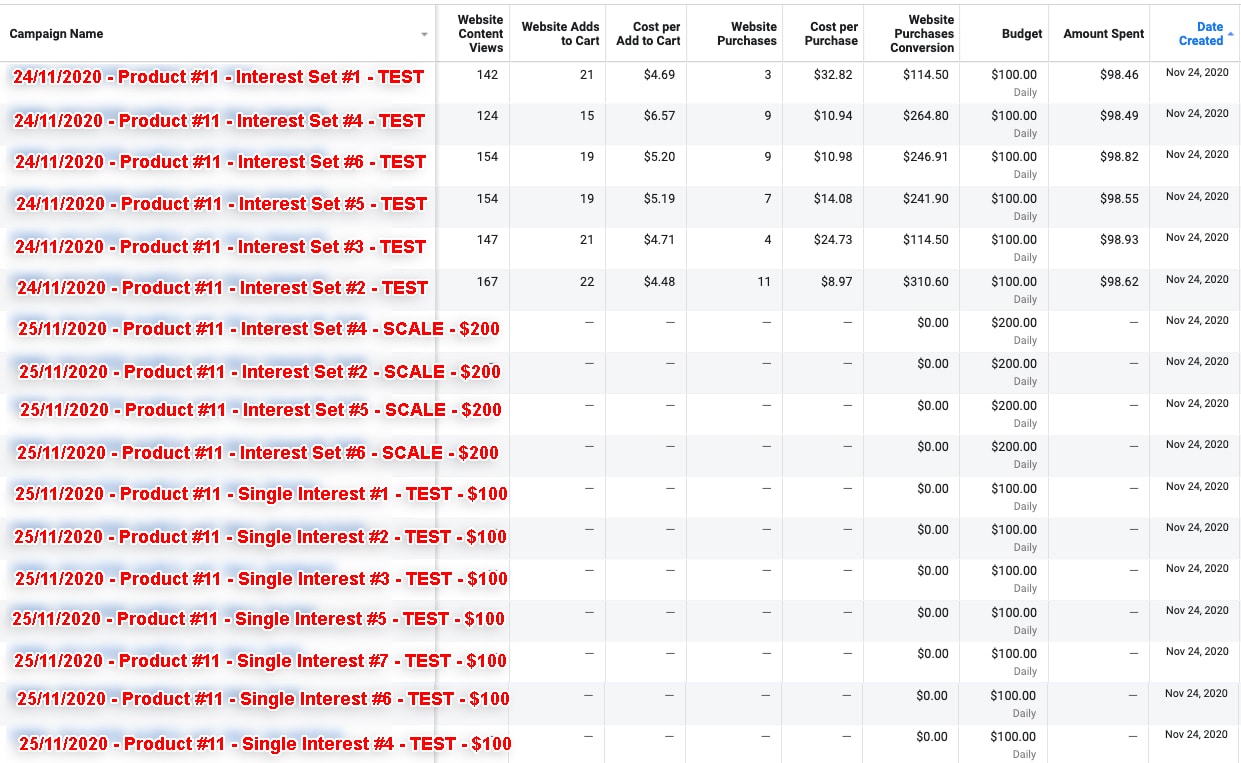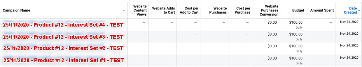 For this product, I created 4 Multiple Facebook Interest Campaigns and set the daily budget to $100 for each one.