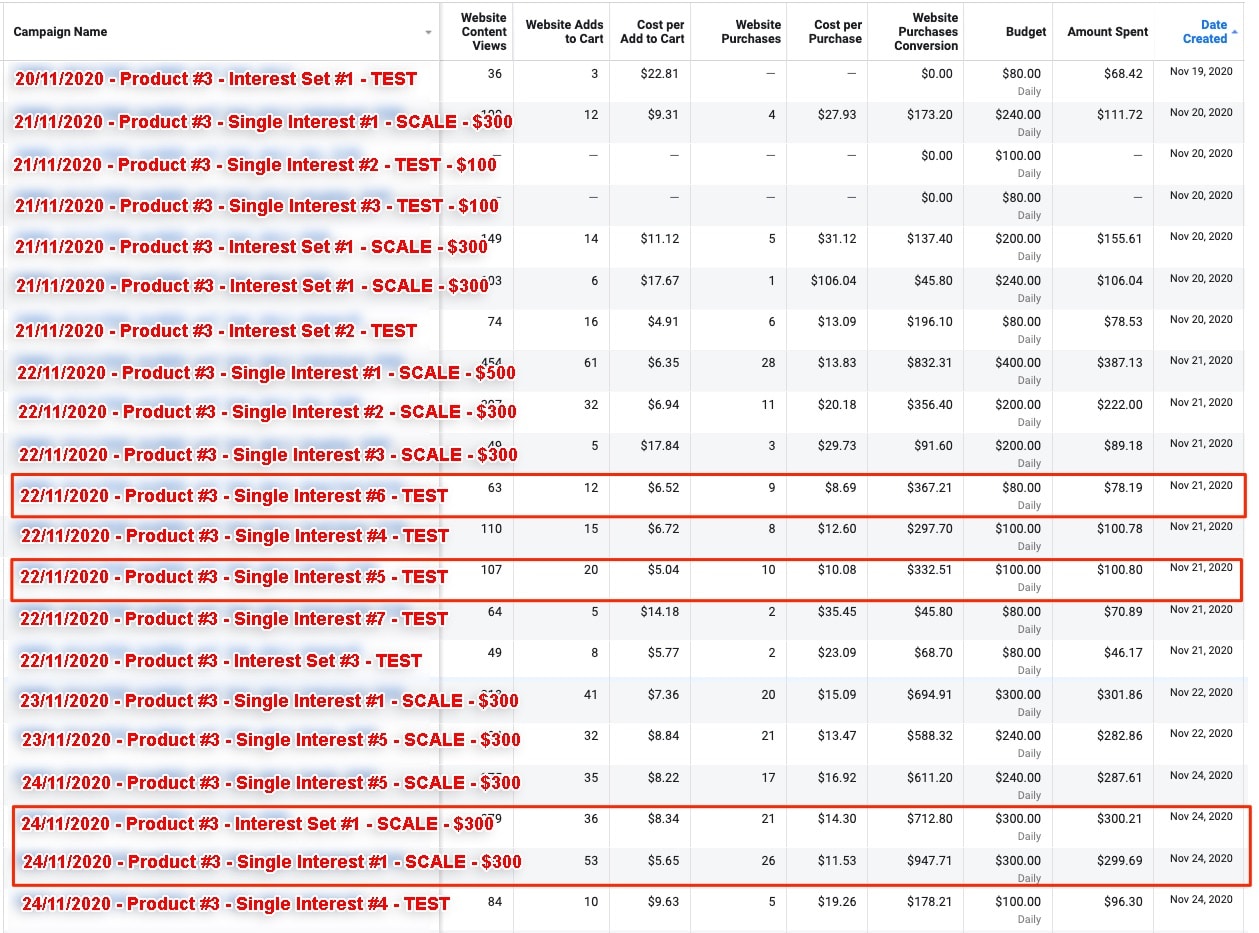 You can see that many ad sets made at least one sale with a CPP lower than $10. I chose a few of them to create new campaigns with a $100 budget. I didn’t choose all the good ad sets to scale this time, because it would be too soon to scale this product.