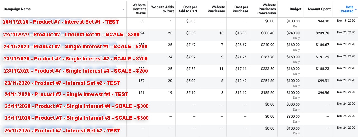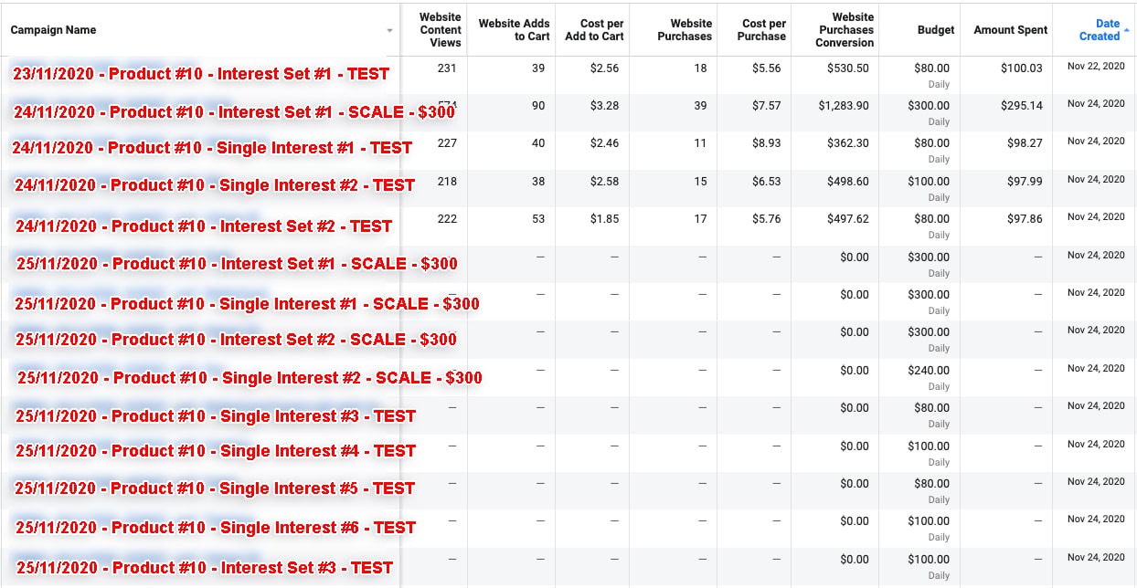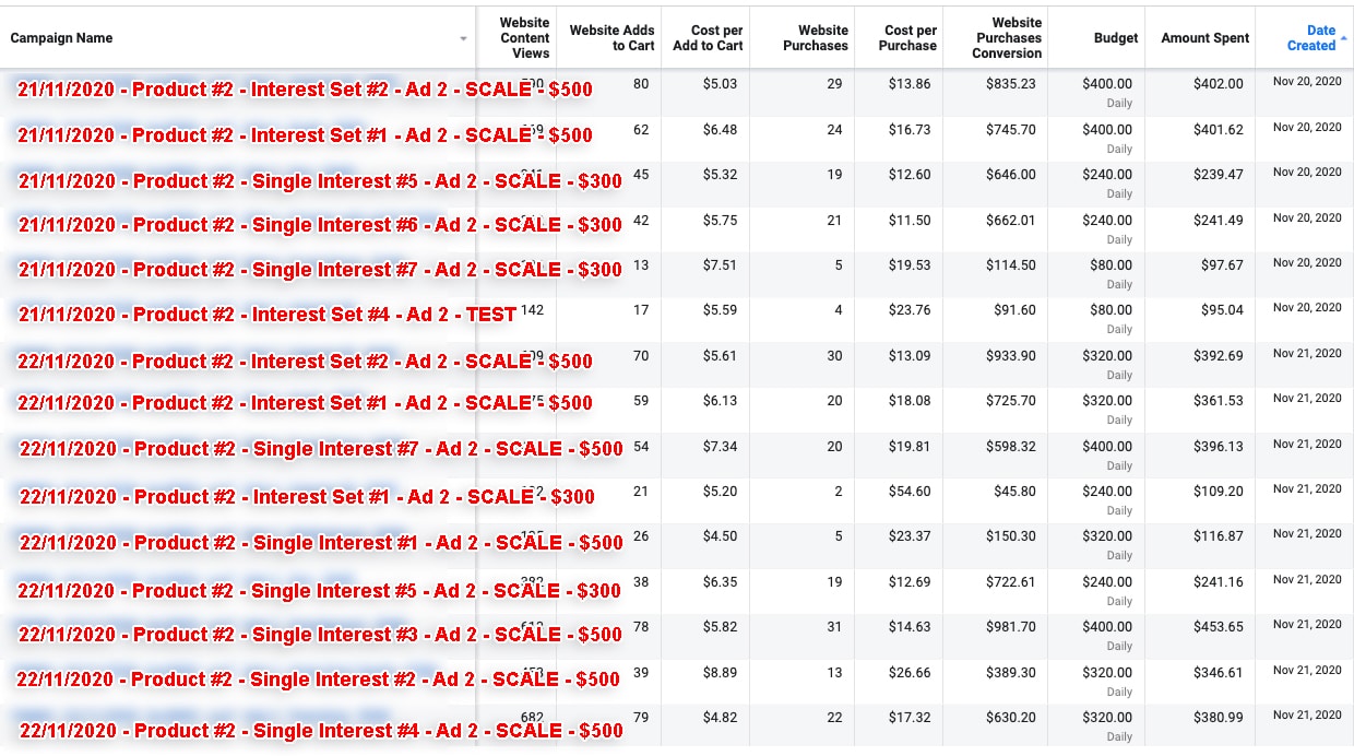 This was easy for me to scale. I just duplicated the ones that were performing well today (all of them, actually) and set the daily budget to $300 each. Then, I created new campaigns from the winning Facebook Interests I found and set the daily budgets to $100. And I expanded the audience by creating Multiple Facebook Interests campaigns with all new Facebook Interests and set the daily budget to $100.