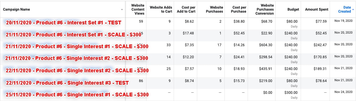 I also created another campaign from one Facebook Interest and set the daily budget to $300, because this interest had been running for a few days and produced good results.