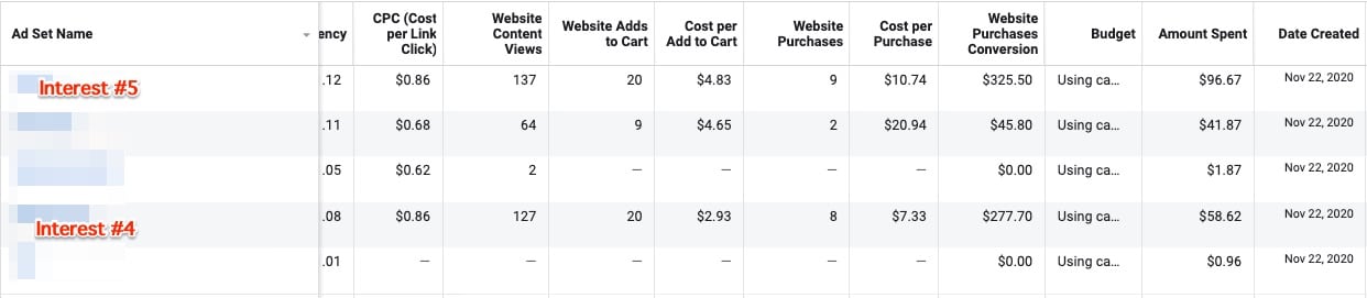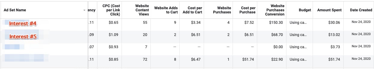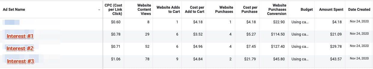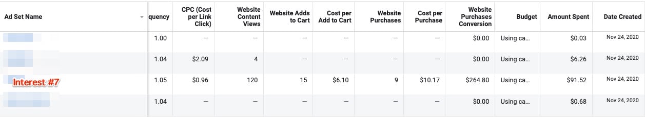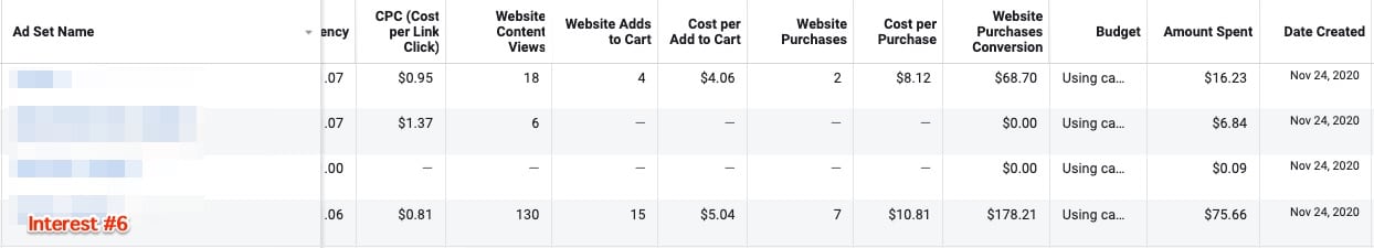 For Interest #3, you might be curious why I chose it to create a new campaign because its CPP was as high as $21.78 per sale. The reason I chose this Interest is because I knew that it had been a winning interest for my old products. I also found that 9 people had added this product to their cart, and the cost per add to cart was only $4.84. I was pretty sure this product could a winner.