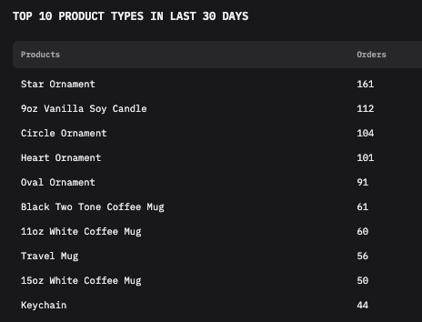 The Star Ornament is still our top seller with 161 sales, and the Candle comes in second with 112 sales.