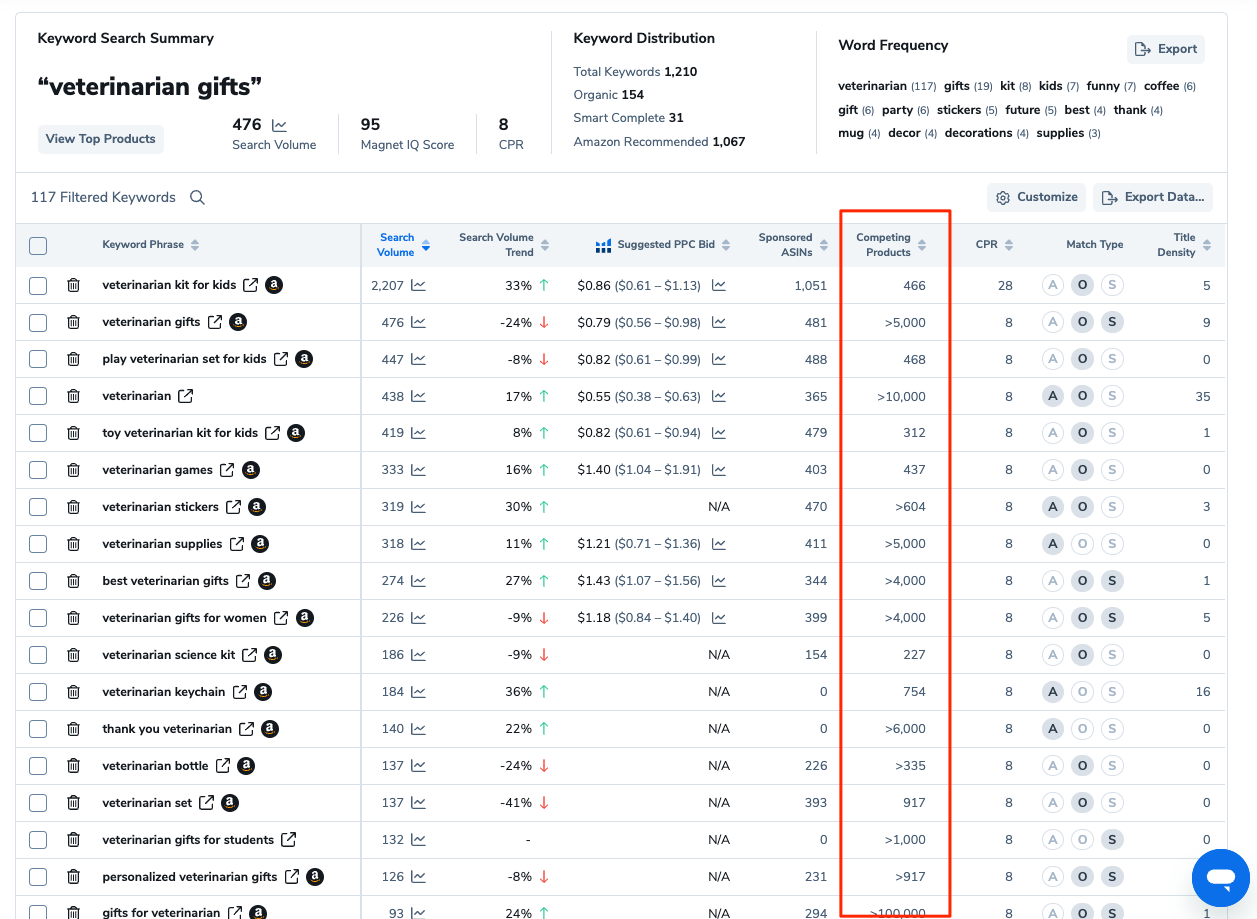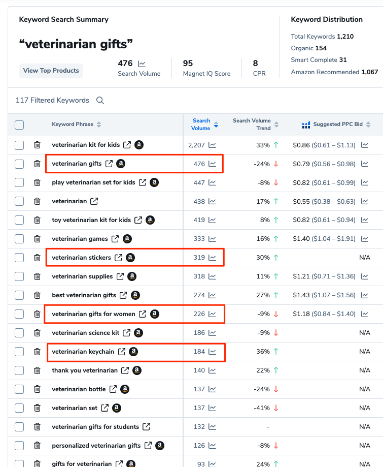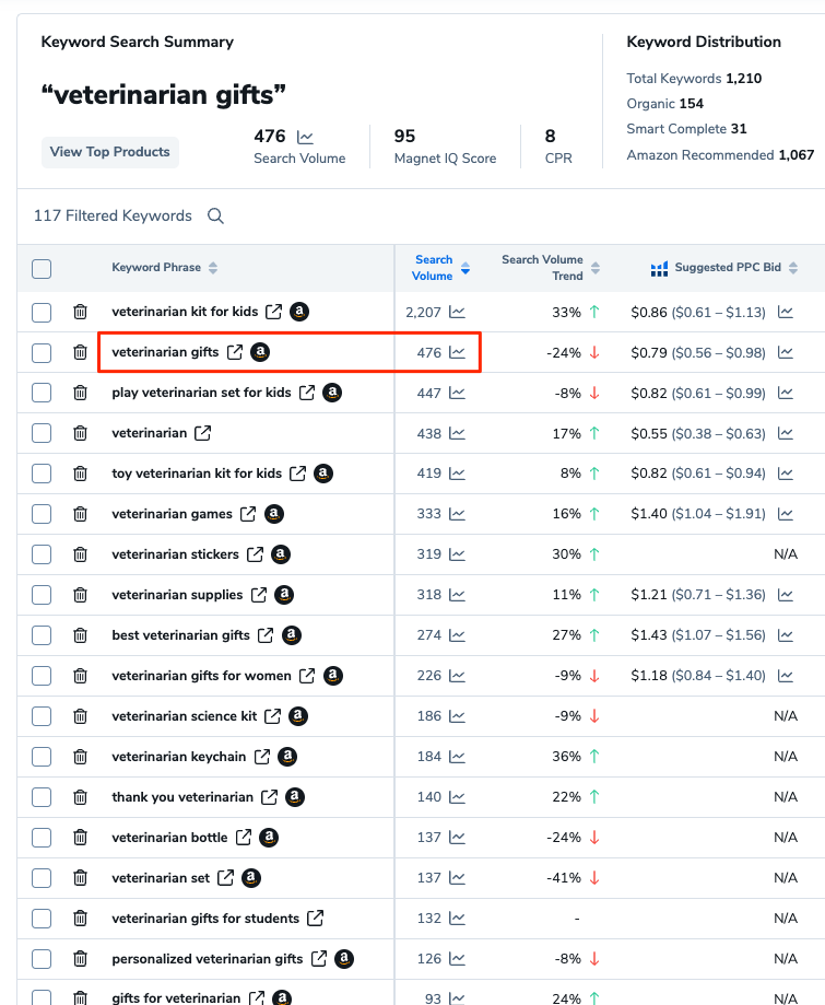 Now, I’ll check the search volume for the keyword** “Veterinarian Gifts”** on Helium10. Here’s what I found:
