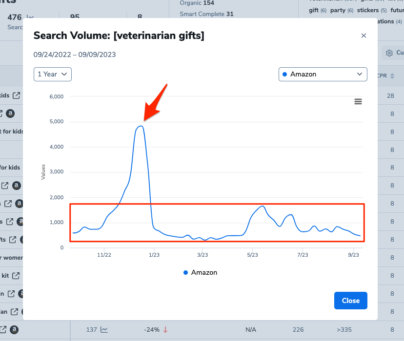 When I look at the** search volume over the whole year**, I see that the keyword “veterinarian gifts” skyrockets to almost 5,000 searches a month in December (that’s when folks are buying Christmas gifts).