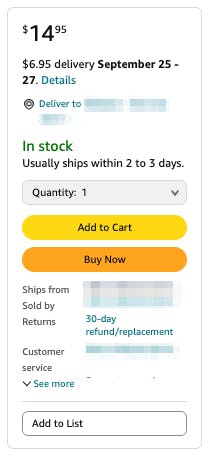 With the buy box, customers can see the price, shipping, quantity, and can easily click “Add to Cart” or “Buy Now.”